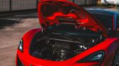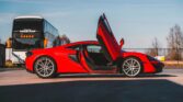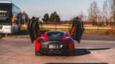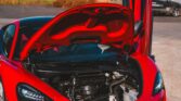 The car is finished in Vermillion Red, offset by numerous black and carbon-fibre highlights.